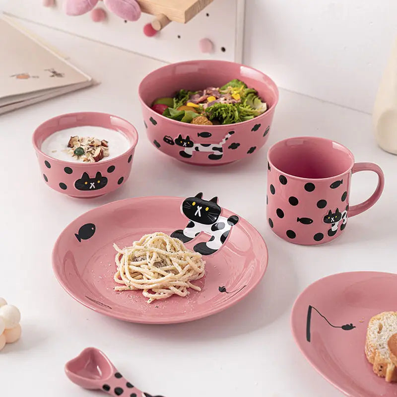 Bring a touch of playfulness to your table with the MeowCharm Dinner Set — a beautifully crafted ceramic collection featuring whimsical black-and-white cat designs on a soft pink base. Each piece combines charm with practicality, making mealtimes more fun for kids and cat lovers alike.